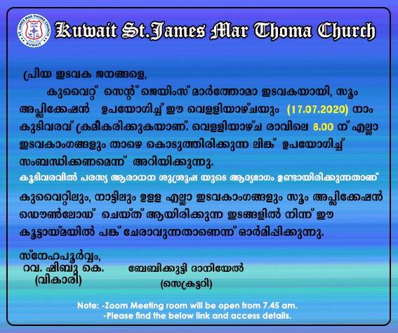 KUWAIT ST.JAMES MARTHOMA CHURCH is inviting you to a scheduled Zoom meeting. Topic: *CHURCH FRIDAY FELLOWSHIP MEETING | 08:00 AM* Time: Jul 17, 2020 08:00 AM Kuwait Join Zoom Meeting https://us02web.zoom.us/j/82018688214?pwd=VGxNc2VaR2JRS0x4Z2s5WFJvNVJlUT09 Meeting ID: 820 1868 8214 Password: 456545